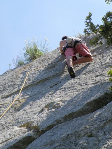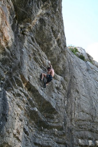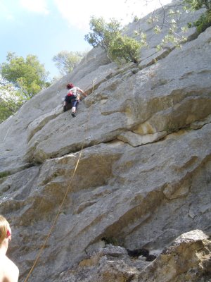 Lezení: drsné vápno, ale některé cesty byly oklouzané. Orientace na jih a jihozápad, do 12h byl stín. Přelezli jsme tady všechno možné včetně jednoho 6a, které moc zadarmo nebylo.