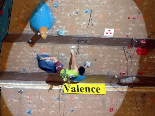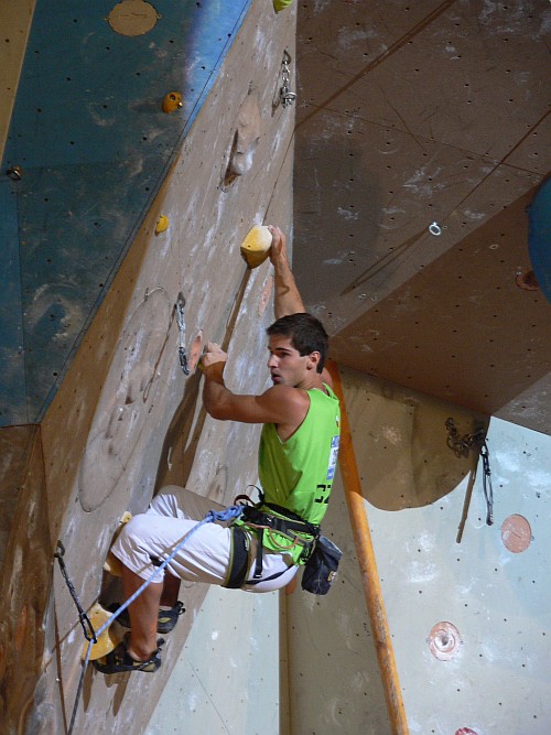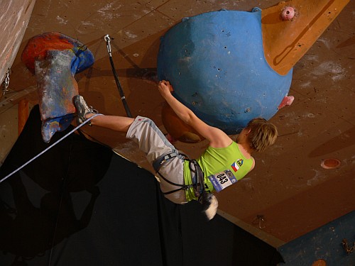 Závěrečné vyprázdnění močového měchýře je docela na poblití, po celém dnu je na jediných dvou “toitoikách“ smradu jak v Cařihradu. Při navazování na hrozně tlustej drát (rozuměj lano), slyším halu praskat ve švech, to domácí francouzský závodník v juniorské kategorii dolézá blízko k topu. Martin Stráník už má v tuto chvíli odlezeno,  podle toho řevu vypadá, že ho Francouz přelezl. Po chvíli už spadne i závodník v mojí kategorii a já můžu konečně začít lézt. Ne že bych udělal nějakou velikou chybu, ale nemůžu se nějak dostat do rytmu. Ve velkých chytech nevím, jestli mám vyklepávat nebo to hrnout dál. No jó, na svěťáku je to rozhodování jednodušší, tam se moc vyklepávat (aspoň s mojí silou) nedá. Ke konci mně ještě ukázkově smekne noha, takže poslední tři kroky dělám totálně na pokraji pádu, ale nějak to do toho topu doklepu (8b). Za odměnu mě zavřou zpátky do izolace ve vedlejší místnosti – kvůli  případné dopingové kontrole, abych jim neutekl. Proč nás všechny nenechali sedět někde vedle stěny, kde by bylo vidět, je mi záhadou. Po čtvrthodince mně oznámí, že jsem vyhrál a musím na dopingovku, kde „to“ moc nejde, takže se zdržíme a stíháme z holčičího finále pouze poslední tři závodnice.