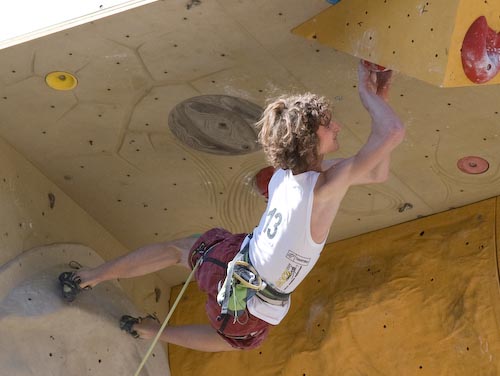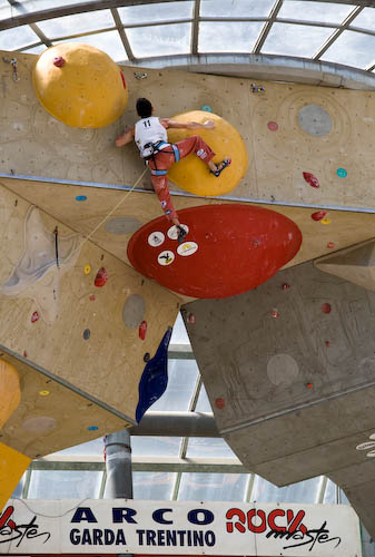 Mužská cesta, jejíž obtížnost se pohybovala okolo 9a,  byla na rozdíl od ženské ze začátku plynulá,  bez výrazných těžkých pasáží.  S prvním boulderem přes malé chyty se museli závodníci vypořádat v polovině cesty přes strukturu, následoval těžký náskok do oblého chytu v převise, oblez struktury  v převise, dále stěnka po oblých a malých chytech a traverz do topu. Pěkně lezl Jorg Verhoeven, který se probojoval k poslední expresce. Stejně tak i Cédric Lachat, který se dostal o kousek výš. Tomáš Mrázek lezl s přehledem a nečekaně spadl ve skoku do obliny v  převise u předposlední expresky. David Lama předvedl odpočinek o strukturu v převise, přelezl stěnku přes obliny, pod závěrečným převisem v koutě vyklepal a spadl několik kroků před koncem cesty v malých chytech. Jeho výkon byl neskutečný. Lezl s rozmyslem a se silovou převahou.  Adam Ondra překonal všechny těžká místa s lehkostí v jeho tradičním rychlém stylu, strukturu v převise přeshyboval, ale bohužel mu nevyšel krok do struktury u poslední expresky. Nepříjemným překvapením závodu bylo vypadnutí Patxi Usobiágy hned na začátku cesty. Jako poslední nastoupil Ramon Julian Puigblangue. Delší kroky v začátku cesty ho naštěstí nezastavily. Pokračoval bezchybným lezením do koutku, kde si odpočinul. Vypadalo to, že sil má dost a cestu doleze, ale zastavil ho skok do stisku jeden chyt od topu. Parádní "představení"!