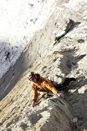 1800 metrovou severní stěnu s těžkým skalním, ledovým a mixovým lezením vylezli Jasper a Schäli volně za 4 dny. Při přelezu, stejně jako při předchozích pokusech, je ohrožovalo padající kamenní, potýkali se s mokrou lámavou skálou, špatným počasím a mizerným jištěním.