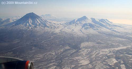 Přílet na Kamčatku, zleva Korjakskij, za ním vyčuhuje Županovskij, napravo od nich Avačinskaja a Kozelskij