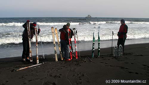 Ubytování mezi jednotlivými výlety jsme měli zařízené u kamarádky našeho vedoucího, který se s ní seznámil v roce 2003, když tam byl podruhé na skialpech, nebo jak on říká - na výletě. Alona nám také pomohla vyřídit veškeré vstupy do parků, pohraničních zón a vojenských oblastí, zařídila nám ubytování, vyměnila peníze, nakoupila plynové bomby, no prostě zlaté ruské děvče. Z letiště, které se nachází asi ve dvacet kilometrů vzdáleném Jelizovu, se tedy nejprve jedeme k ní vybalit, a pak máme v plánu se jít projít k oceánu. Z krátké procházky se nakonec vyklubala 10 km běžkařská tůra, což na skialpech po rovině není žádný med, navíc po 11 hodinovém časovém posunu oproti Evropě. Někteří tak místo výletu k oceánu šli spát, jiní na kafe do goroda, a jenom já s bruderem Liborem, vedoucím a už aklimatizovanou slovenskou skupinou jsme byli u oceánu. Vedoucí nám tvrdil, že každý den na Kamčatce musíme stát na lyžích, což se mu tímto i podařilo splnit. Odměnou za rovinaté běžkování na skialpech byl ovšem úžasný výhled na Tichý oceán, až na pláž jsme dojeli na lyžích. S lyžákama a v GORE věcech jsem tedy ještě po pláži nechodil.