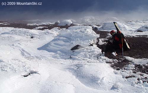 Ve středu 29. dubna vyrážíme na nižší z dvojice sopek – Avačinská (2741m). Převýšení z chat položených asi v 850 metrech je téměř 1900 metrů, což není žádná prča vzhledem k tomu, že se jde klikatě lávovými koryty. Na vrchol v šíleném větru a s dobou výstupu cca 7 hodin (vedoucí tam byl naposledy v roce 2003 za lepších podmínek za necelé čtyři hodiny) dorazila v tomto počasí pouze čtveřice, já s Adamem jsme to otočili asi 300 m pod vrcholem. Osobně jsem to otočil kvůli obavám z únavy z hodně ledového sjezdu, protože jsem s sebou tahal své lopaty jak jim kluci přezdívají (LINE PROPHET 100).