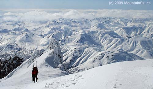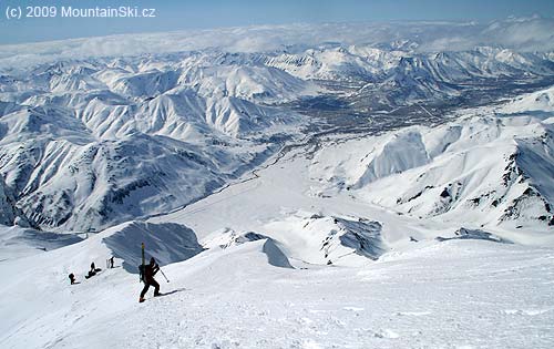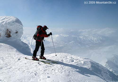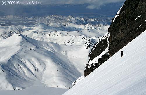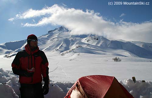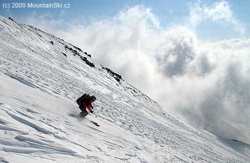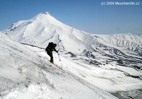 Sjezd z Avačinské byl tedy ledový, ale dlouhý, v dolní části i s trochu rozměklým sněhem. Cestou dolů potkáváme skupinu ruských horolezců, kteří po mě chtějí zapalovač, aby si mohli připálit cigáro. Zapalovač se mi z batohu v tom větru a mrazu vytahovat vážně nechce, a tak pokračujeme dál. Doba sjezdu kolem hodiny a půl samozřejmě s přestávkami kvůli nohám. Jak říkám, ten led není žádný požitek při takovém převýšení. Dole v chatě je třeba se pořádně nadlábnout a jít spát, protože ve čtvrtek máme v plánu vystoupit na Korjakskij (3456m) po hranici sněhu. Tento drobek se základnou s převýšením nad okolní krajinu přes 3000m v listopadu 2008 bouchl a vrchních 1000 výškových metrů tak pokrývá sopečný popel a prach k lyžování nevhodný. Sníh končil v cca 2400 metrech, kde tedy sundáváme pásy a jsme připraveni na sjezd s převýšením asi 1600m. Počasí dnes téměř bez větru krásné rozhledy na protější sopku s rozměklým firnem ve žlebu, takže paráda. Sjezd byl famózní a v horní části docházelo při zařezání lyží k vzdušnému pohybu nejenom sněhu, ale také sopečného popela, který byl skrytý pod ním. Líbilo se nám to natolik, že jsme si vystoupili ještě na jeden z bočních hřebenů k dalšímu sjezdu.