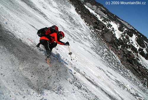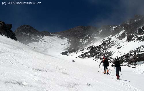 Výstup jedním ze žlabů na Korjakskij na konec sněhu