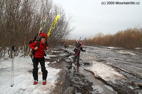 Návrat do civilizace korytem Suchoj rečky, pěšky s lyžemi na báglech