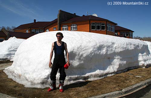 Náš pobyt na druhé straně zeměkoule se přehoupl do druhé části, čekal nás ovšem pro mě ten nejkrásnější zážitek z celé Kamčatky. Po klasickém půldenním pobytu v gorodě (tedy Petropavlovsku-Kamčatském) vyrážíme ruským vězděchodem-gruzovikem značky Kamaz směr vulkán Viljučinskij (2173m). Jak poznamenal Matúš, Kamaz zná jedinou překážku – prázdnou nádrž, přičemž ten náš ji prázdnou neměl. Viljučinskij je samostatná majestátná sopka, jejíž svahy se začínají zvedat od řeky Paratunka asi 150 metrů nad mořem na druhé straně Avačinské zátoky. Z goroda je Viljučinskij krásně vidět, ale je to pekelně daleko. Vedoucí to šel posledně s dalšími třemi sadomasochisty z městečka Těrmalnyj k Viljučinskému pěšky a na skialpech, zatímco my jsme to z Těrmalného jeli přes dvě a půl hodiny Kamazem. Pronájem auta se spotřebou 1 litr/1km sice na něco vyšel, ale při představě šmatlání této vzdálenosti na lyžích to každý rád zaplatil. Je to dlouhá cesta v hlubokém sněhu, do něhož Kamaz zapadal po nad nápravy. Myslím, že u nás není auto, které by to zvládlo kromě V3S a Hummeru. Po poledni nás naštvaný řidič (při sledování okolní krajiny s nosem přilepeným na okno nám totiž jedno vypadlo i s rámem ven) vyhodil na místě. Stavíme tábor a v mlze a teple vyrážíme aspoň na 400 výškových metrů malý výstup.