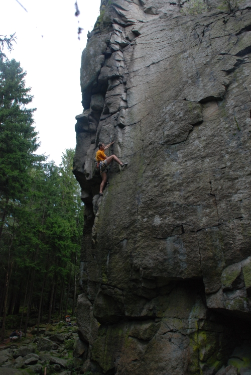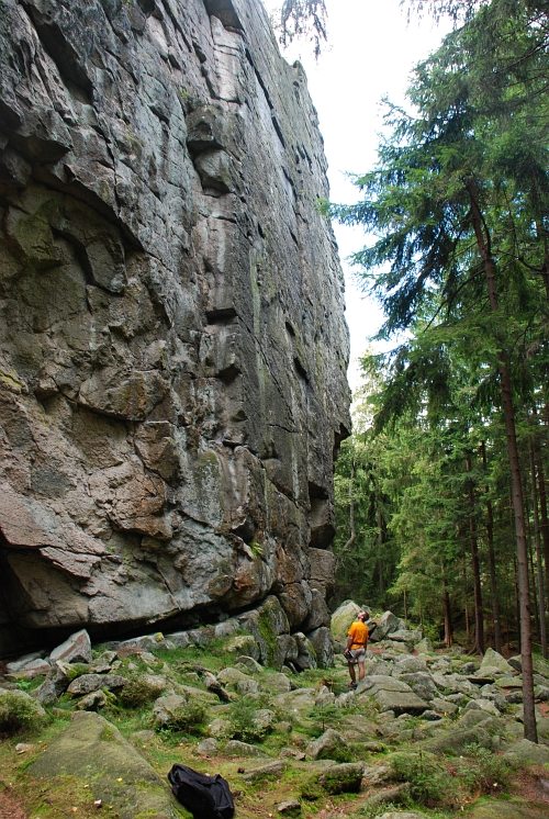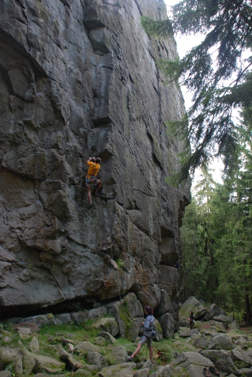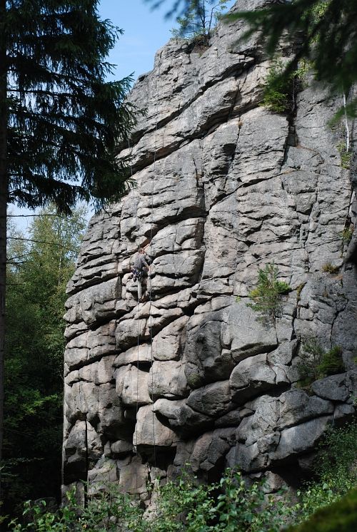 opět asi 12 cest na skálu vysokou až ke 20m, opět je stěna ukrytá mezi stromy a proto je dobré lézt za sucha