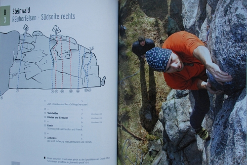 Popisuji zde pouze masiv Rauberfelsen, ostatní skály jsou podobného charakteru, ale již nejsou tak dominantní a jsou na nich o něco lehčí cesty. Ale vybere si každý. Na lezení je dobré vzít s sebou sadu friendů (vkl.) dá se s nimi pohodlně dojistit většina cest. Těžší cesty jsou přesto celkem kvalitně osazeny borháky a na dolezech jsou slaňovací oka.