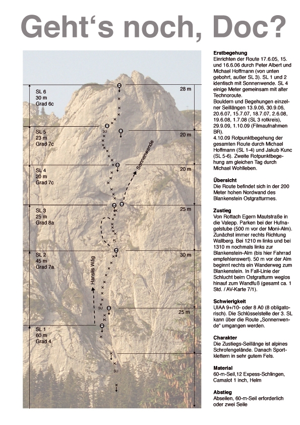 První cesta se  jmenuje “Geht’s noch Doc?” a nachází se v Bavorských Alpách nedaleko Tegernsee. Cestu vynýtoval před třemi lety horský vůdce Peter Albert (www.steile-welt.de) a spolu se známým německým lezcem Michi Hofmannem (www.rotpunktschule.de).
