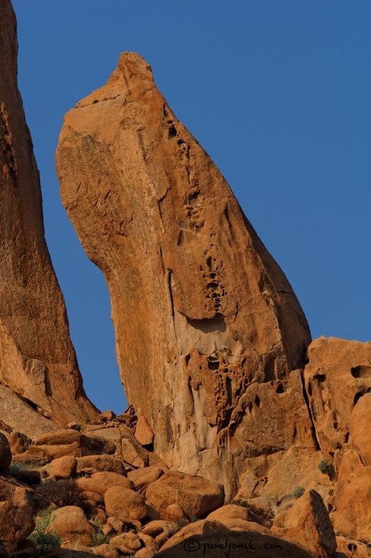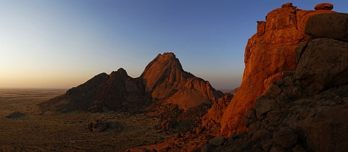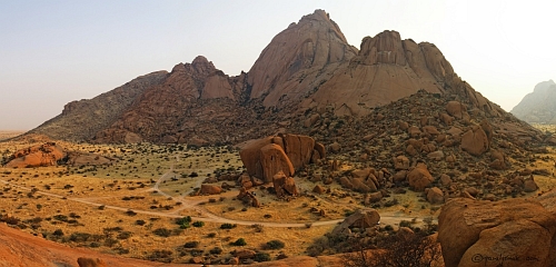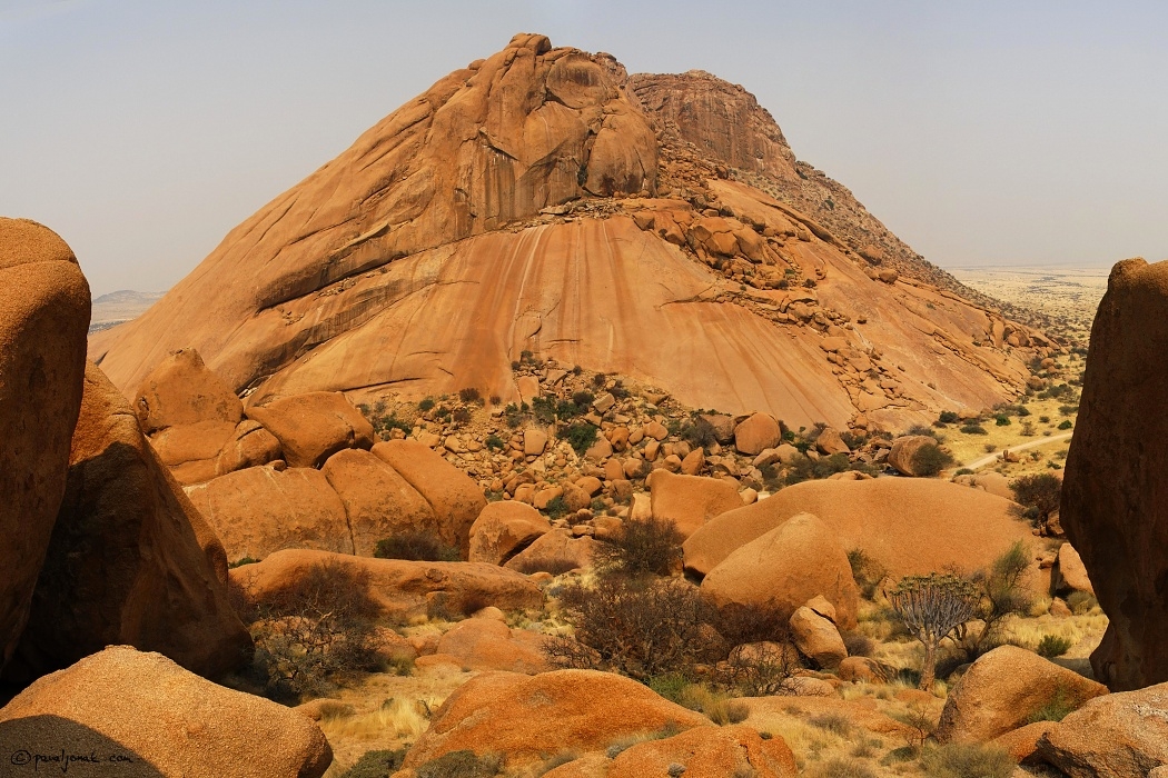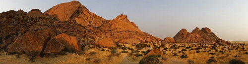 Nemá smysl se tady teď zdržovat, kupujeme nějaký zásoby a pálíme rovnou dál.  Venku z města to naštěstí jde, silnici většinou nakreslil projektant z bodu A do bodu B rovně, takže dokud je asfalt, cesta celkem letí. Zbytek z dvěstěpadesáti kiláků pod Spitzkoppe je už po polňačce první třídy, ale celou cestu plackou bez kopců takže to jde. Z pouštní roviny se začínají v oparu ukazovat obrysy žulových monolitů a vpodvečer jsme na místě. Krajina plná žulových bloků vypadá v zapadajícím slunci jako na Marsu a konečně si naplno uvědomuje, že jsme zase v Africe. Jsme docela hotoví po cestě a v deseti minutách, než se okolí potopí do tmy běháme kolem bloků s otevřenou pusou, takže stan stavíme tradičně potmě.  Máme po dvou dnech cesty celkem dost.