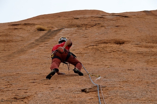 Sjezdovka se pokládá do sklonu Kitzbílu v Ádru a postupně už po čtyřech dolízáme na obrovskou podvrcholovou polici. Dolez na vršek je ve znamení orientačního závodu změtí věžiček, komínů a zarostlých polic. Frekvence návštěvníků není asi taková, jak by si tahle rozhledna v poušti zasloužila. Vzhledem k tomu, že slunko nám pere do hlav už několik hodin, fotíme pár záběrů a jedeme dolů ke štandu, kde máme vodu. Balíme věci ze zdi a slaňujeme, máme hotovo!