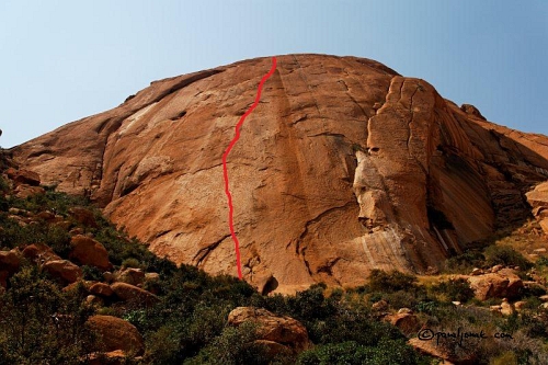 Všude okolo je šutroviště z žulových bochanů neskutečných tvarů, za zády máme Sugarloaf, 300 m vysokou žulovou klouzačku s vynýtovanými rajbasy na pár délek s nejtěžší klasou kolem 8uiaa. Největší kousek je vidět odevšad, čtyřistametrová naštěstí mírně položená JZ stěna Spitzkoppu, kde vede pár vynýtovaných cest často hodně strmou plackou, na to aby se dala nazvat rajbasem. Většina směrů má 12 délek a klasa osciluje podle sklonu a typu lezení až po 9- sem tam s nějakým technickým flekem. Stěna má pořád místo na prvovýstupy a to je to, proč jsme tady.