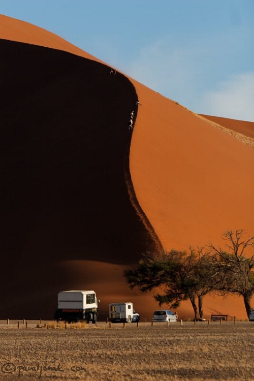 Mažeme směr Etosha, což je míň známá sestřička rezervací plných divokých zvířat, jako jsou Kruger nebo Masai-Mara. Mě svrbí v batohu objektiv Canon 70-200L IS-USM, což je na focení zvyřátek prima zbraň. Místní safari se liší tím, že můžete používat vlastní auto, sítí polňaček projíždět divočinou a cvakat spouští jak Japonec u orloje. Co se moc nedoporučuje, je vystupovat z auta, nebyli bysme první koho sežral lev při focení mimo auto... další kousky s naším pidiautem zažíváme při cestování skrz pouštní krajinu jižní Kalahari a návštěva červených dun Sossusvlei je zážitek z jiné planety. A taky ta kobra pod autem... Ale to už s lezením vlastně nemá nic společnýho...