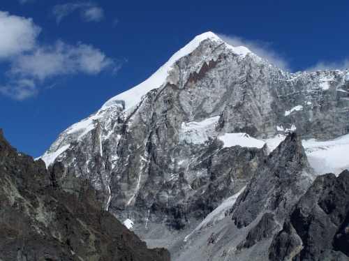 Lamo-she 6.070 m, dosud jediná výstupová linie vede po levém hřebeni