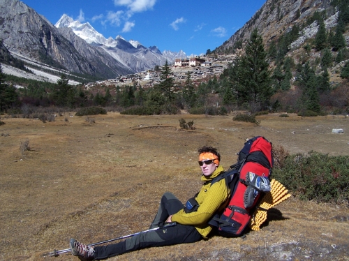 Treking je dobrovolné sebetrýznění…V hlavním údolí masívu Genyen. V pozadí 600 let starý klášter Lenggo a granitový skvost Sachun