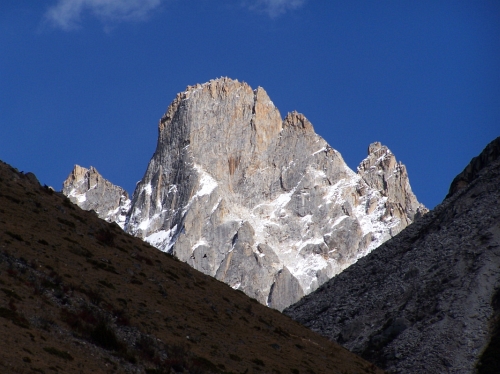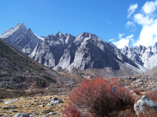 Pohled směrem do hlavního údolí Genyen. Ostrý vrchol uprostřed s názvem Phurpa jako jeden z mála tady vylezli Američané na podzim 2006