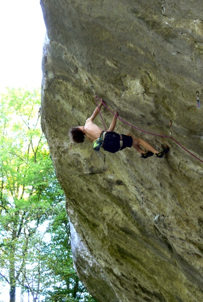 Cesta má asi 35 metrů s konstantním sklonem víc než 50 stupňů. Zhruba do půlky to je silově vytrvalostní 8c+, po kterém následuje boulder s hodně dlouhými a silovými kroky, který by byl  samostatně 7C+. Nad tím už je to tak 8b/b+. Padal jsem tedy v klíčovém místě, a párkrát v první části kvůli vylomení chytů či uklouznutí. Samotný úspěšný pokus byl celkem zajímavý. Po několika pádech v posledním klíčovém kroku, kde se jde nejistý kříž do trojprstové dírky na backhand, jsem v tom pomalu začínal mít psychický blok. První dva pokusy toho dne nevyšly, tak jsem dal dlouhou pauzu, oběd (nudle s melasou), rozlezl se znovu v 7c+ a po 20 minutách šel na to. V klíčovém kroku jsem si plánoval, že tam prostě nesmím váhat a zkusím to tam napálit.  Psychicky jsem ale „vyměkl“. Naštěstí při tom pársekundovém váhání mi palec pravé ruky popojel o centimetr výše, kde se mi do kůže zahryzl malý hrůteček, a to bylo přesně to, co jsem potřeboval. Ke konci už mi sice docházelo, ale už jsem to nepustil.