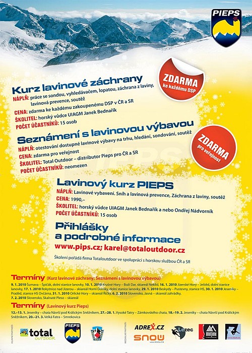 3.Lavinový kurz Pieps – klasický dvoudenní lavinový kurz, kde se budete kromě práce s lavinovými vyhledávači, lopatami, sondami… učit strategii pohybu, aby k žádným lavinovým neštěstím nejlépe nedocházelo a nebo jste bez váhání znali a použili veškeré doporučené postupy. Na všech kurzech bude k dispozici kompletní sada vyhledávačů dostupných v současné době na trhu, lavinový "trenažér" ART který simuluje jednoho až 5 zasypaných, nebo si zde budete moci prohlédnout a odzkoušet lavinové batohy SnowPulse a ABS. Cena kurzu je 1990,- Každý kurz je veden mezinárodním horským vůdcem UIAGM Jankem Bednaříkem nebo Ondřejem Nádvorníkem. Podrobnější informace a registraci naleznete ZDE.