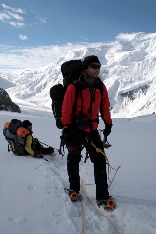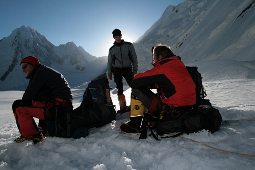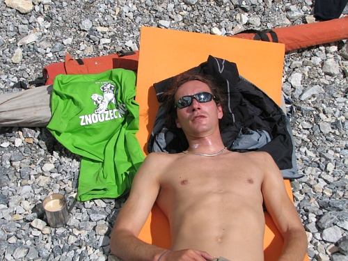 V noci jsem docela trpěl, ráno jsem nebyl schopen udělat 3 kroky. Takže jsem i uvažoval o vrtulníku. Ale ten by stejně mohl přiletět max jen do campu 1 ve výšce cca 6tis. Takže jsem si zobnul dva růžováky (ibalginy) a hurá dolů. Kuba mi vzal věci a Jarda s Dowem mi pomáhali při slanění - dost jsme používali i naše lano v japonským kuloáru. Šlo to překvapivě dobře, takže po příchodu do campu 2 (v cca 16h, výška cca 6400m), kde byl Kamílek, jsme se domluvili ještě na dalším sestupu do campu 1 (6tis.), neboť se mělo kazit počasí. Doktor prostě na to koukl a řekl, že to bude gut. Vzal jsem tedy dalšího růžováka a hurá dolů. Došli jsme sice za tmy, ale došli.