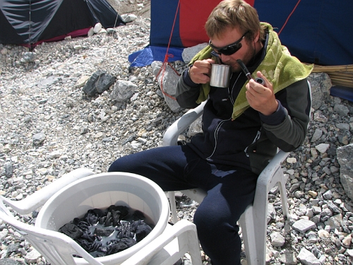 Zato další den byl pekelný. Můj pomalý postup přes ledovec z campu 1 do BC byl hororový zážitek. Jednak vedro, jednak již hrozně širokých trhlin. Při přeskocích jsem i ja "tvrďák :-))" asi 3x plakal, když jsem šlápnul na špatné koleno. Ale nějak jsme to zvládli a teď již píšu s fajfkou, kávou, přejezen z BC.