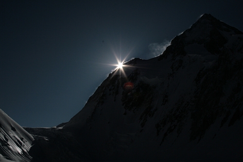 V campu 3 nad hranicí 7tisíc se nás vyskytuje asi 14 - Španělé (5), mezinárodní expedice, my a Korejka s 2 šerpy. Večer se domlouvají ostatní s Korejkou, že půjdou s nima v 1.30hod. My ráno nespěcháme. Nebudeme určitě rychlejší než šerpové s kyslíkem. Ó jaký však omyl. Jdeme rychle, po předních hrotech a brzy doháníme velikou skupinu, která neustále postává a čeká až šerpové buď cestu prošlápnou či některé úseky i zafixujou. A pak hurá všichni na lano. Spíše bych řekl, že se nám tam jejich šerpové pletou. Postupujeme taky průběžně nejištěni vedle nich a ve vrcholové partii cca 400 m pod samotným vrcholem jsme první Jarda, Kuba, já a Daw v cca 9h. Hrozně fouká. Kuba to otáčí. My postupujeme dál sami - Daw, Jarda a já. Zde je již lezení o něco vážnější a o cca 200m výše nás dohání šerpa a že bude fixovat.