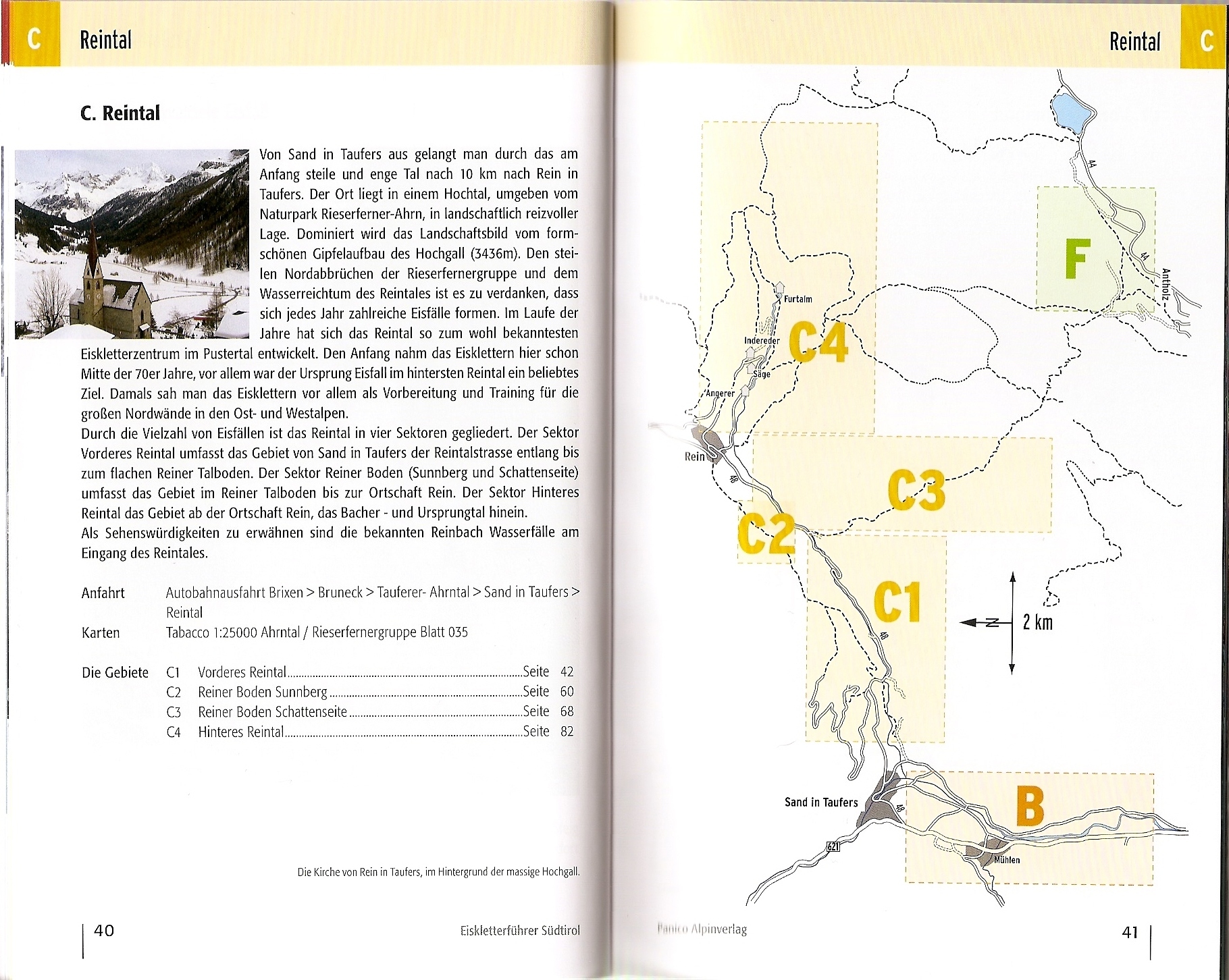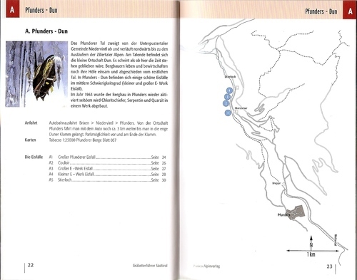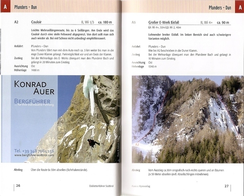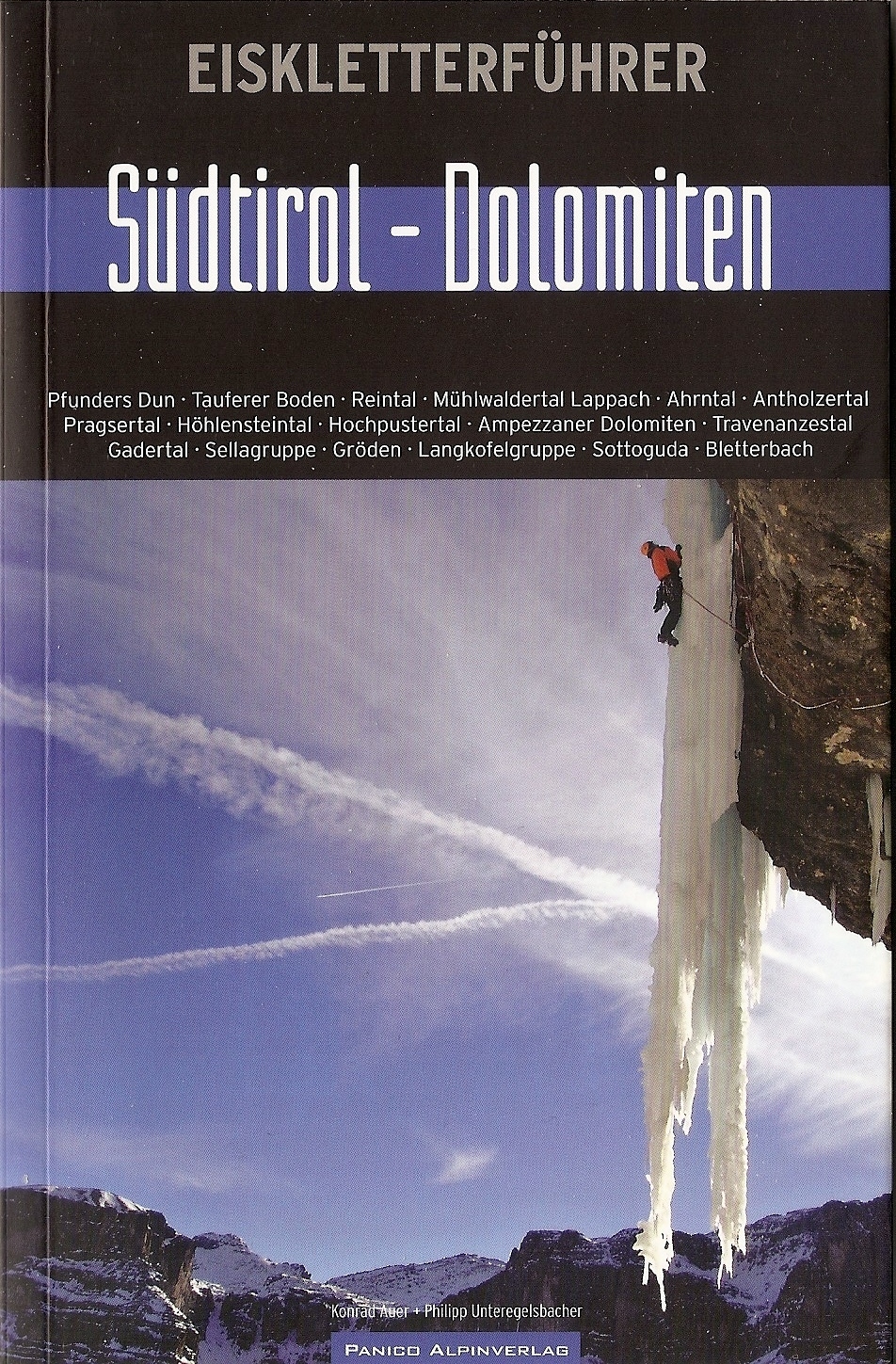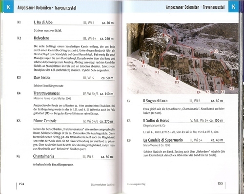 . Formát o kousek menší než A5, tloušťka asi 1 cm, všecko barevné, na černomodré obálce vyniká rampouch a mrak. Úvod napsal Hans Kammerlander . Mapa na zadní stránce, kde je vidět, kde ty ledové oblasti jsou a barevné rozlišení odpovídající členění průvodce (14 kapitol s písmeny A – O) včetně legendy. To je slušné. Jenom nemůžu najít seznam všech cest, nebo nějaké vodítko kam na relax, kam na prásky a kde jsou mixy. Škoda, asi autory tlačil čas. Taky souřadnice GPS tam nemají. Tak je to věc autorů, jakou má průvodce podobu, ale třeba se na tyhle vychytávky budu moct těšit v dalším vydání. Ale jinak je to paráda, seznam oblastí a sektorů, kupa základních informací – počasí, led a bezpečnost, slaňování, ubytování. Hodnocení obtížnosti, technické náročnosti lezení v ledu i mixová stupnice.  Popisy oblastí, příjezdové trasy, čísla map Tabacco 1:25000, obrázky map s přístupem, barevné fotky ledů s vyznačenými směry lezení. Informace o ledech: název, autoři, obtížnost, přibližná délka, údaje o jednotlivých délkách, příjezd, přístup, čas, orientace, nadmořská výška, způsob sestupu popř. čas. V sektorech kde je více cest (v některých je jen jeden led), jsou potom také základní informace k jednotlivým cestám. No a znovu opakuji hromada báječných fotek z lezení rampouchů.