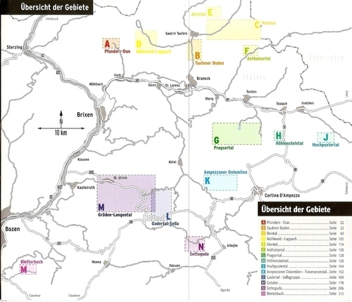 Pfundersdom, Tauferer Boden, Reintal, Mühlwaldertal Lappach, Ahrntal, Antholzertal, Pragsertal, Höhlensteintal, Hochpustertal, Ampezzander Dolomiten, Travenanzestal, Gadertal, Sellagruppe, Gröden, Langkofelgruppe, Sottoguda, Bletterdach.