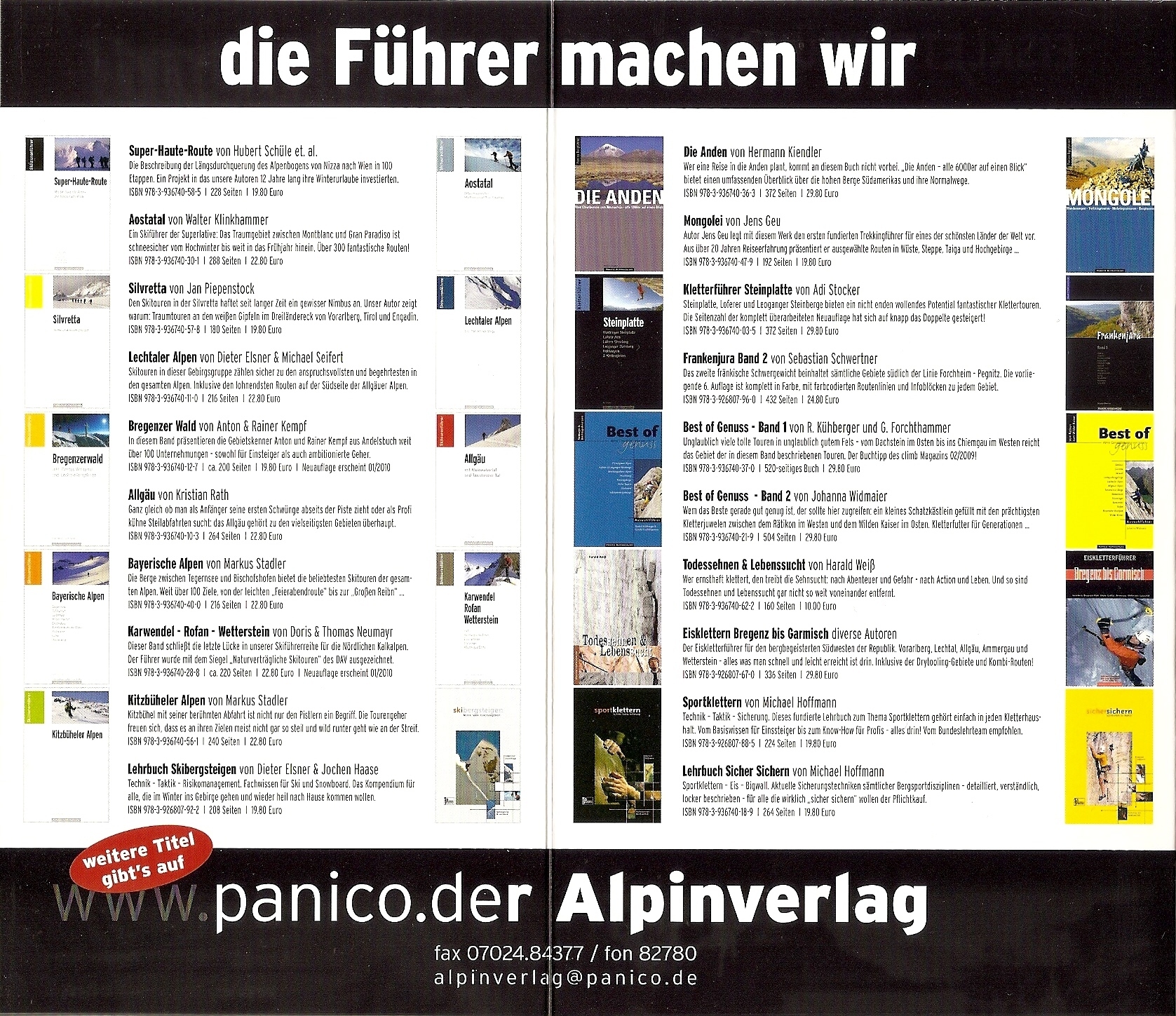 a vypadá to, že nepůjdu spát brzy. Nějaká ta horolezecká němčina, to se docela dá. Na první prolistování dobrý, průvodce se jim fakt povedl. Jak to dělají, že mají takový nápady na fotky, jsou zajímavý, jsou i hodně slušný. V příštím životě chci umět pořádně malovat a fotit. Třeba hroty mačky zabodnuté do tenké záclony, no a jak oběhaly všechny ty kopce, aby vyfotili ty ledopády z dálky, nebo z vrtulníku? Určitě to jsou taky dobří skialpinisté a véháťáci, ano - autoři jsou horskými vůdci. Tak to je dobrý, snad dostanou něco z mé investice.