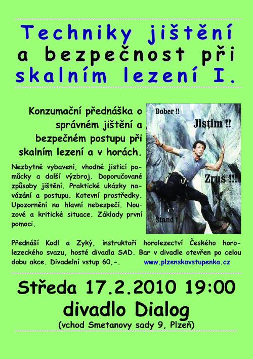 Další z metodických "konzumačních" přednášek: Techniky jištění a bezpečnost skalního lezení I. se koná ve středu 17.2.2010 od 19:00 v plzeňském divadle Dialog (vchod Smetanovy sady 9).