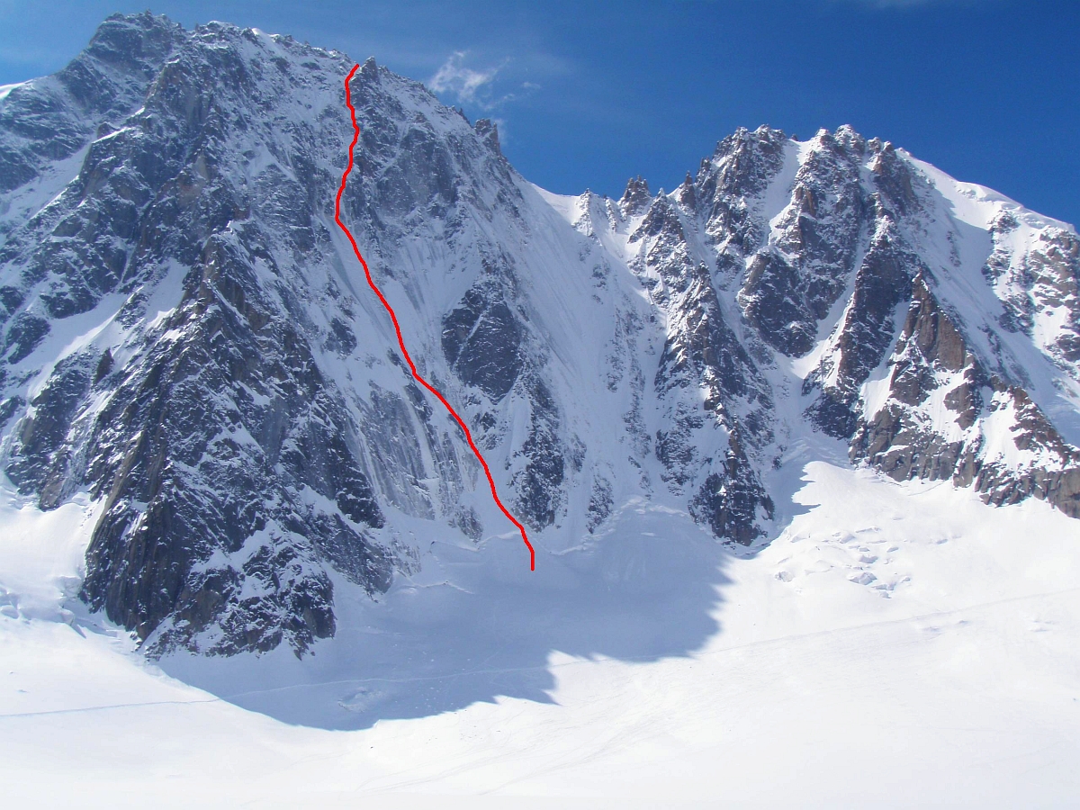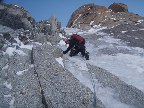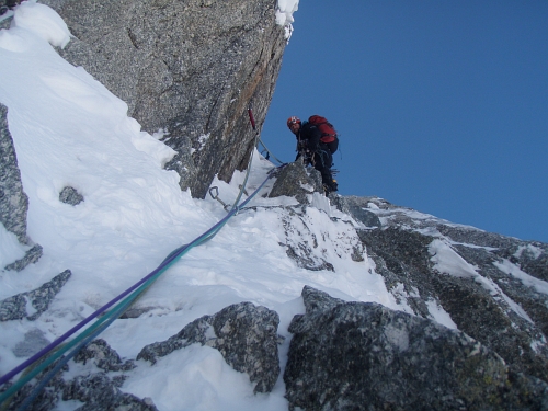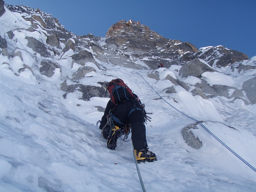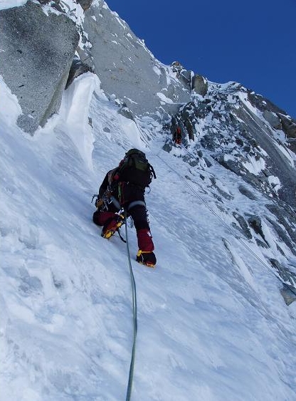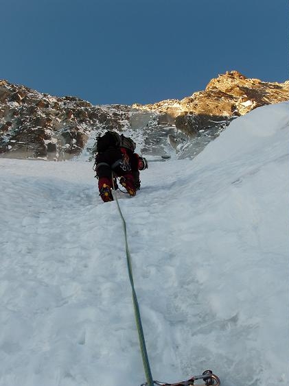Obtížnost: 1000m, ED, 4/V (z 5/VII max možných), cca 14h lezení, 2h nástup a 6h sestup, my lezli pomalu, protože nás brzdili frantíci před námi, tvrdej led a na konci moje otlačené nohy