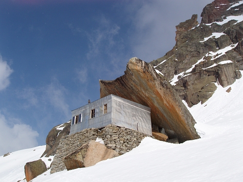 Cesta končí v sedýlku Breche des Droites, odkud je slanění žlabem asi 400m přes tutové štandy na ledovec. Odtud směr bivakovací chata Couvercle (2687m) cca 2h, které se také říká chata pod pokličkou. Jsou tam nějaké erární deky a hrnce atd. My ji měli plnou a nebylo defakto kde lehnout - kdo dřív příjde, dřív mele. Přístup k chatě nejlépe z leva údolíčkem podél ledovce a pak doprava nahoru. Z chaty je ideální sejít žlabem směrem na spojnici ledovců Leschaux a Mer de Glace a pak na vláček na Montenvers a do Chamonix (18éček).