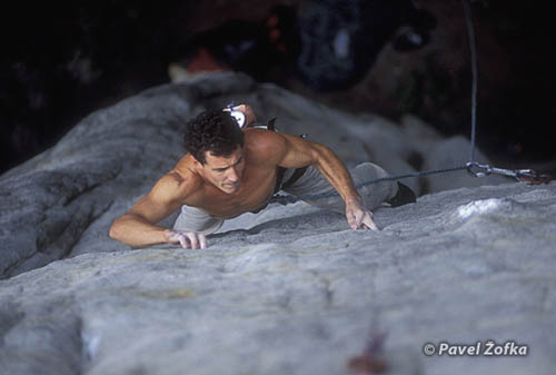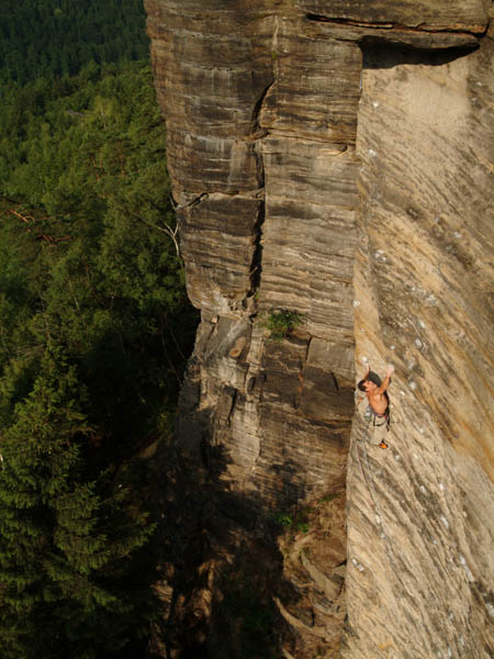 Patřil jsi a troufám si tvrdit, že stále patříš mezi nejlepší pískovcové lezce u nás. Jezdil jsi hodně i do vedlejšího Saska, kde jsi po sobě zanechal několik těžkých prvovýstupů, z nichž některé dosud nemají opakování. Osazovat  jištění daleko od sebe ti přišlo jako něco přirozeného, viděl jsi za tím úctu k pískovci, k tradicím, nebo za tím stálo rčení nemáš na to, nelez do toho?