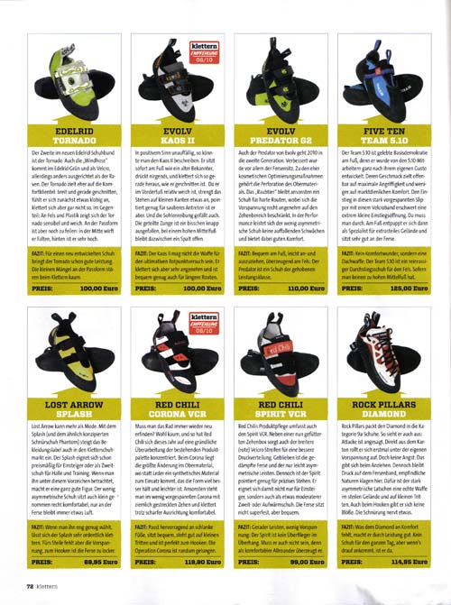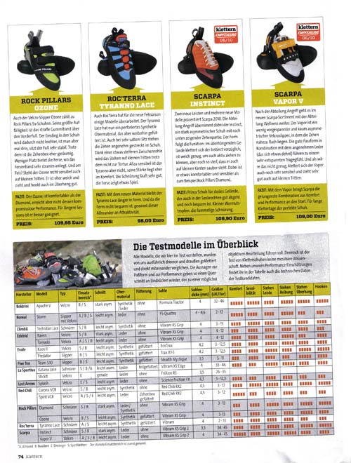 náhledV červnovém čísle německého časopisu Klettern vyšel test lezeček. Testováno bylo téměř 20 modelů lezeček různých značek - La Sportiva, Scarpa, Boreal, Red Chilli, Evolv... Najdete mezi nimi také Diamond a Ozone QC od českého výrobce Rock Pillars.