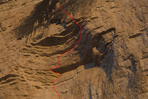 Délky: 7b, 6c, 6a+, 6c+, 7a+, 8b+ (60 metrů, 7 nýtů), 8c (20 metrů, 4 nýty), 6c, 6c+, potom sestup cestou via Cassin.