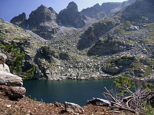 Někdo nám říkal, že dnešní úsek je v turistickém průvodci označen za nejpůvabnější a potvrdilo se to. Vycházíme zase brzo, skautíci mají ještě půlnoc. Precizně jsem si sbalil, jsme na hory navyklý, jde se krásně, prázdnější krosny, no žůžo. Cesta vede přes kamenné pole a kolem spousty jezírek a potůčků, no ta příroda je jeden velkej kýč ale nádhernej. Nemáme moc vody a z jezírek se nám moc brát nechce, jdu srát a objevuji pramínek, co se dere přímo ze skály. Hurá vodička čisťounká. V 10:45 se vydrápeme z kaňonu do sedla, otočíme se a máme Pirin jako na dlani, famózní výhledy. Dále cesta pokračuje po nenáročném hřebínku, už ty nádherné vyhlídky ani nefotím, ve 12 dáváme delší pausu na vysušení stanu a dalších věcí na bezejmenné hoře. Sluníčko krásně hřeje a tak se tam asi hoďku vyhříváme, absolutní ticho, nikde ani živáčka, jen orel skalní plachtí hlubokým údolím, fantazie. Asi ve 4 hod přicházíme k Tevnému ezeru a rozbíjíme stan, je zde docela pěkný lágr, ale venkovní sprcha z vodou z jezera a v zaslonu dáváme omeletu, bob čorbu a pívečko Zagorka, mají tu ale docela draho, následuje čajík a meditace nad jezerem. Potkáváme zde kolegu z práce Ivana Šaleho v policejních kanadách, holt svět je malý. Hbitě vytahuje i placku…ha ha ha . V očekáváni, že od jezera půjde v noci zima se nabaluji, ale pak se zase slíkám, jelikož se ve spacáku těžce potím.