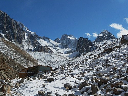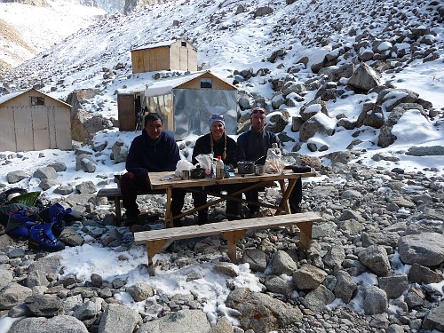 Z parkoviska v doline Ala Arche, vo výške cca 2100 m vyrážame slušne na ťažko naložený na tri dni aj s lyžami do prvého bivaku Ratcek vo výške cca 3200 m. Miestni obyvatelia to síce honosne nazývajú "chata", ale je to v podstate "winterraum" ako ho poznáme z Álp. Kammenná chata bez personálu poskytuje spanie v jednej chladnej miestnosti, kde sú poschodové postele. V okolí chaty su menšie "búdky" - niektoré sú privátne bivačiky miestnych horolezcov či horských vodcov a niektoré slúžia ako kuchynka na varenie. Veľké pozitívum tejto chaty je, že je tu sauna. No na naše sklamanie v tomto období bolo už málo vody v prameni pri chate a tak sauna bola mimo prevádzku.