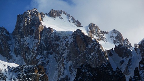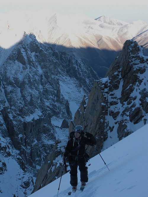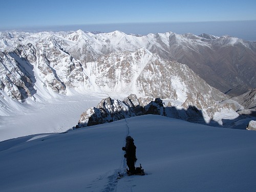 Pokus o spánok v hoteli Korona moc pozitívne nevyšiel a tak vstávanie ráno o 4 hod nie je problém. Problém je len tá zima čo nás ovalila, keď sme vyliezli zo spacákov. Teplomer vonku ukazuje -11°C. V bivaku je len o málinko teplejšie, ale keďže nám do rána zamrzli v hrnčekoch všetky zostatkové tekutiny, o mnoho to neni. Hodinku teda varíme čaj a dávame ranajky. Okolo 5 hod. vyrážame z bivaku. Výstup hore mi trval cca 5 hodín a aj keď už všade okolo svieti slniečko, my šlapeme celú cestu v tieni, pretože sme na západnom svahu. Táto dávka mrazu mi však spôsobila trochu omrzlín na nohách a tak po príchode pod prvú skalnú vežu na hrebeni (cca 4600 m) sa rozhodujem pre ukončenie výstupu. Dá sa ešte cca 200 m vyššie k druhej skalnej veži, ale pre záchranu zdravia som si túto pasáž odpustila.