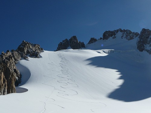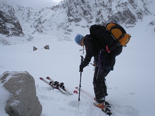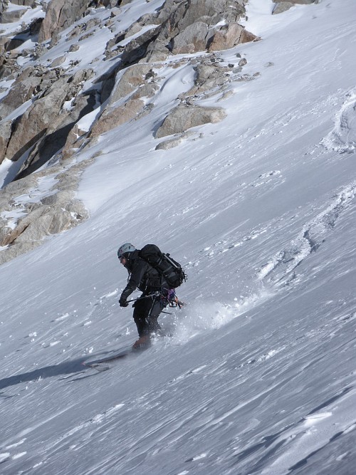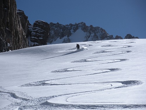 Zjazdík dole je zážitok, aj keď zo začiatku cítiť výšku takže po 4 oblúkoch som nútená zastaviť a vydýchať. Väčšinou je prašan, len na dvoch úsekoch (v strede a v dolnej časti) sa vyskytla aj kôra alebo ľad. Za hodinku máme zlyžované na bivak. A už nás čaká len ten brutálny zostup morénou a dostať sa dole do doliny k autu. V tento deň sme teda absolvovali zostup vkuse o 2500 m nižšie.
