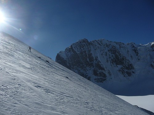 na Koronskom ľadovci, druhý strmí výšvyh ľadovca pred nami. Po pravej strane sa týči impozantná stena Iziskatela – výzva to pre extrémistov (50 – 55°).