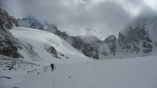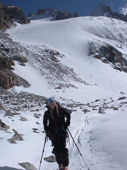 Predošlý deň výstup na Ratcek bola celkom drina s tou vynáškou všetkého matrošu, takže dnešné ráno som sa utešovala, že veď to je do ďalšieho bivaku "len" dákych 500 výškových metrov. To som ale netušila aká drina ešte len dnes príde. Výnsť hore morénou ľadovca Ak-Sai bola neskutočná drina a aj keď to nebolo veľa výškových metrov trvalo to snáď 4 hodiny. Prirovnala by som to chodeniu po kladine s 15 kg batohom a v lyžirkach. Bolo to jedno obrovské suťovisko skál, ešte aj čerstvo posnežené, takže nebolo ani vidieť kam je treba stupiť a kde je diera medzi skalami, ktoré sa aj tak pri každom kroku pod nohou prevracali. Proste čo krok to balans. Keď sme sa dostali na ľadovec Ak-Sai a mohli si už obuť lyže na nohy to bolo doslova vykúpenie.