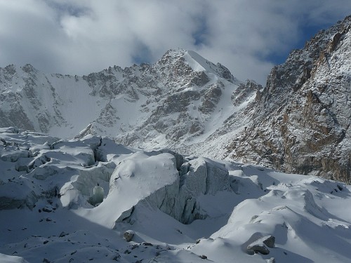 pohľad z morény na čelo ľadovca Ak-Sai, v pozadí Pik Teke-Tor 4479m