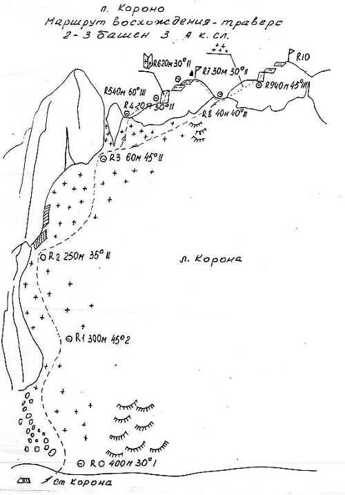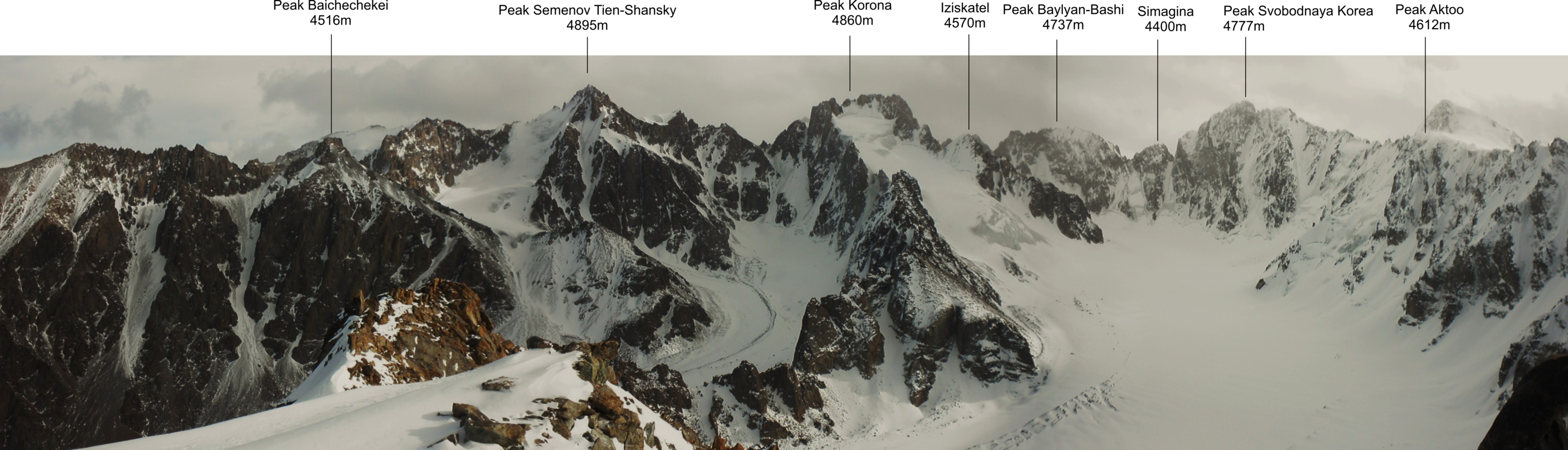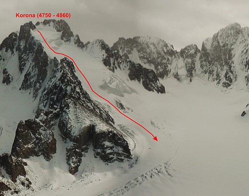 pod Koronským ľadovcom, v pravo sa týčí Pik Svobodnaja Korea. Úplne v ľavo na skalnej moréne je žtlý bivačik – „hotel Korona“ takto honosne má napísané nad vchodom.