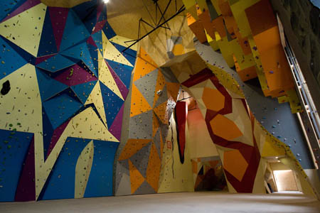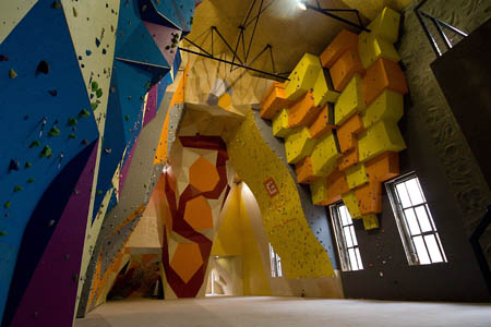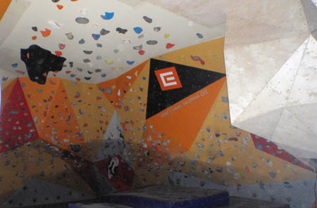 Přijdeme, koukneme a říkáme si „to zase budou bandasky“. A taky že jo. Stěna je monstrózní a my začínáme tiše závidět, protože u nás nic takového není. Uprostřed haly je zajímavě strukturovaný kýl, který má 16 metrů do výšky, lezeckých metrů vymotáte 25, a když si k tomu přidáte kolečko na bouldrovce, která je vzadu za kýlem, tak na vás čeká 40 metrová vytrvalostní cesta. Napravo od kýlu se můžete vlnit v lehce zvlněné „třicítce“ (13-15 metrů). Zbytek pravé části stěny tvoří kolmé profily a specialita stavitelů „schody do nebe“.
