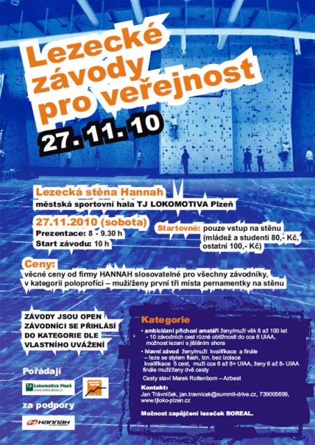 Dovolujeme si vás pozvat na závody pro širokou veřejnost a "nejlepší z nejlepších" západočeských lezců konané 27.11.2010 na stěně Hannah - TJ Loko Plzeň (www.tjloko-plzen.cz/)
