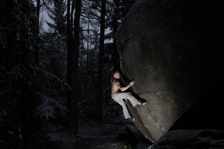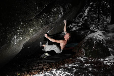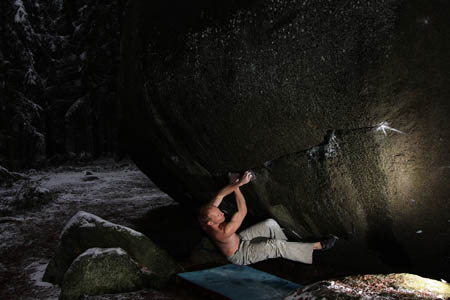 Boulder je bohužel poměrně často mokrý. Na mé straně stál suchý podzim. V zimě to bude určitě vymrzlé, ale bude nutné si očistit sníh z výlezu. Já jsem to vylezl skutečně za 5 minut dvanáct, foceno 5 minut po dvanácté, v tom hnusu fakt lahůdka. Nevýhodou je to, že v okolí není moc co lézt, takže tam člověk jezdí fakt jenom za tím jedním kouskem.