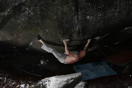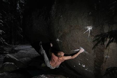 Výsledkem je boulder „Knocking on heavens door“, snad 8C. 15 klíčových kroků a pak ještě za odměnu (nebo za trest? – podle podmínek) pětimetrové 6C+. Je to silovina. Na první pohled jsou tam hrozně veliký chyty. Většinou se lezec pohybuje v převisu kolem 45°s prachmizernýma stupama.