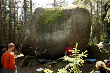 Dědek je prostě krásnej kámen. Prý největší bludný balvan ve Střední Evropě. A zvolená linka je prostě jedinečná. Vzpomínám, jak jsme tu před čtyřmi lety byli po Petrohradské PADání s Tomášem a Adamem (ano, s tím nejsilnějším Tomášem a nejsilnějším Adamem) a oni se bez většího rozmýšlení rovnou pokoušeli urvat alespoň pár kroků z jasné silové linie s mizernýma stupama. Tehdy jsme tuším udělali asi čtyři nebo pět z patnácti klíčových kroků.
