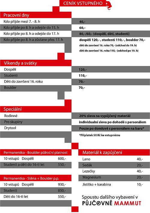 Ceník jsme se snažili sestavit tak, aby si každý našel svoji optimální dobu pro lezení a peněženku. Navýšením cen u dětí ve večerních hodinách se snažíme o to, že děti večer by už měly koukat na večerníček a lezení v tuto dobu přenechat dospělým. :-)