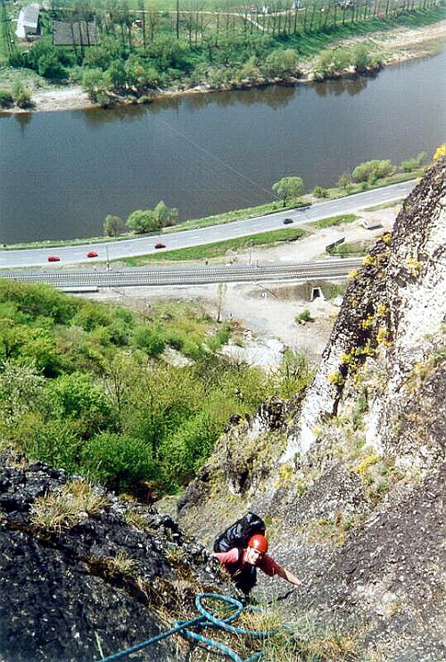 trať nepřeložili, skály naopak ještě důkladněji potáhli pletivem, leč tyto jsou v PRAVÉ části Kozího vrchu. Popisované trasy jsou v LEVÉ části kopce (jak snad bude patrné ze snímků, které by zanedlouho měly k článku přibýt). Restrikci stran železnici chápu (Kdo z nás by chtěl shodit šutr a vykolejit EC Lojza Negrelli), stran zdejší úžasnou přírodu ne. (Na ceduli o rezervaci na úpatí Kozího vrchu se o ničem takovém nepíše.)